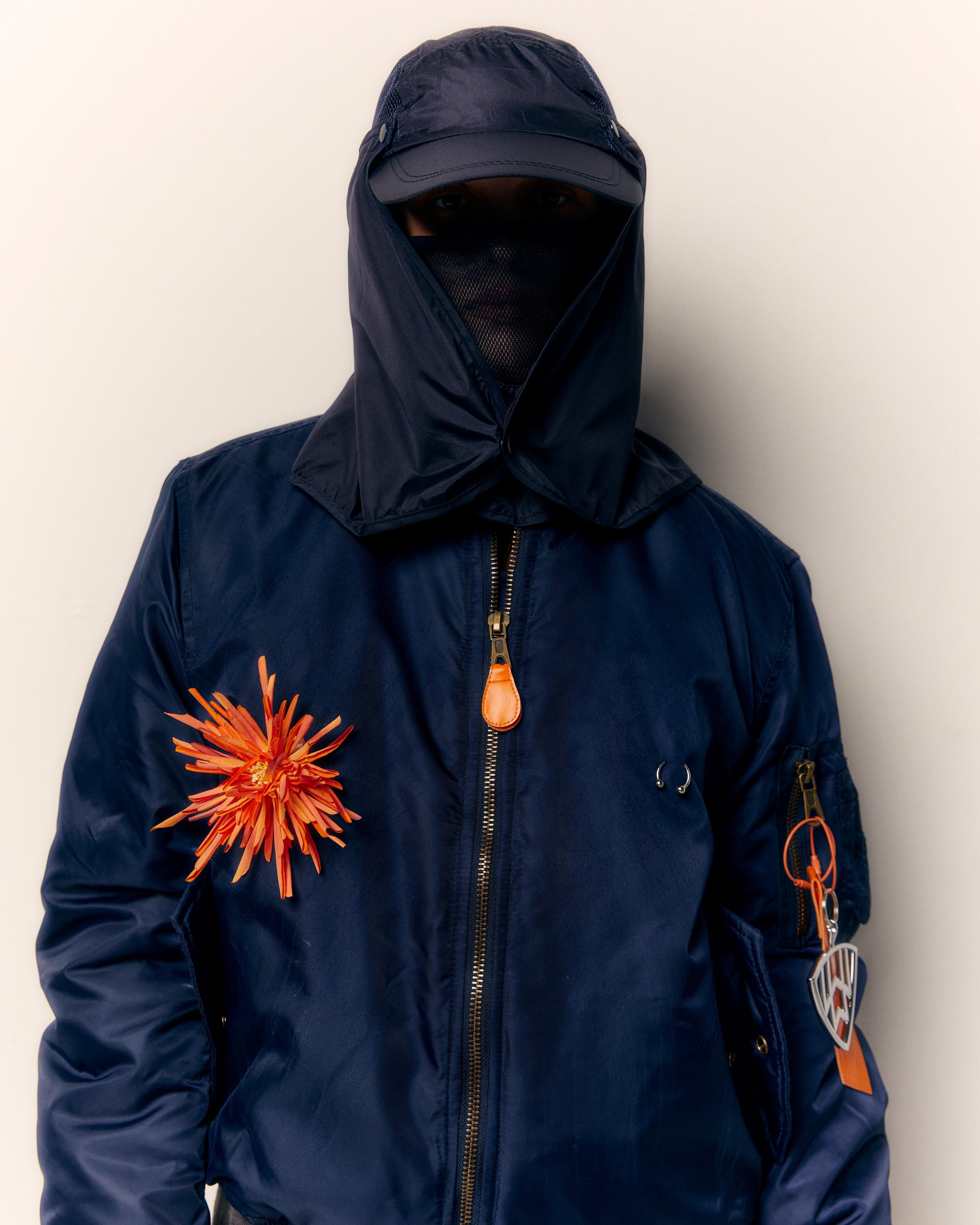 Classic MA-1 reversible flight jacket made in Japanese nylon with leather zip and tag details. Each jacket has been sun aged , hand distressed and vandalised with love. Each piece is unique. Arm pocket comes adorned with leather AOR flight tags and broken Maybach or Mercedes metal emblem.